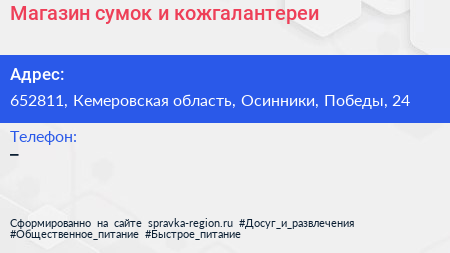 Магазин сумок и кожгалантереи по адресу 652811, Кемеровская область, Осинники, Победы, 24 в дальнейшем Организация, размещена в следующих категориях: