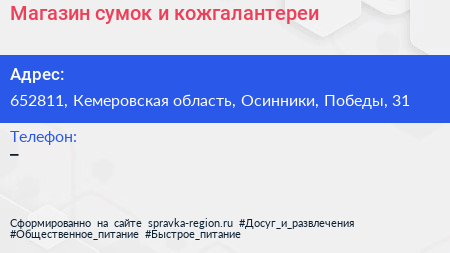 Магазин сумок и кожгалантереи по адресу 652811, Кемеровская область, Осинники, Победы, 31 в дальнейшем Организация, размещена в следующих категориях: