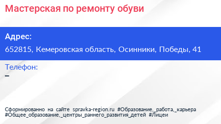 Мастерская по ремонту обуви по адресу 652815, Кемеровская область, Осинники, Победы, 41 в дальнейшем Организация, размещена в следующих категориях: