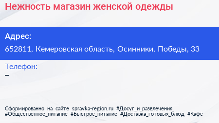 Нежность, магазин женской одежды по адресу 652811, Кемеровская область, Осинники, Победы, 33 в дальнейшем Организация, размещена в следующих категориях: