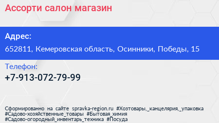 Ассорти, салон-магазин по адресу 652811, Кемеровская область, Осинники, Победы, 15 в дальнейшем Организация, размещена в следующих категориях: