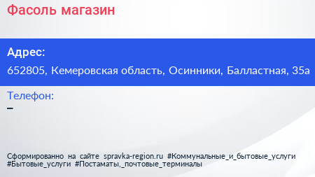 Фасоль, магазин по адресу 652805, Кемеровская область, Осинники, Балластная, 35а в дальнейшем Организация, размещена в следующих категориях:
