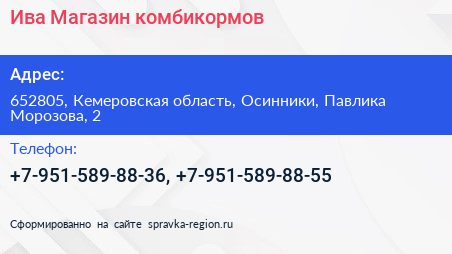 Ива, Магазин комбикормов по адресу 652805, Кемеровская область, Осинники, Павлика Морозова, 2 в дальнейшем Организация, размещена в следующих категориях: