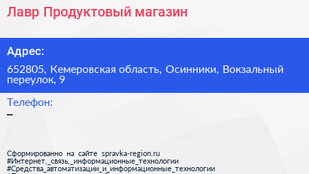 Лавр, Продуктовый магазин по адресу 652805, Кемеровская область, Осинники, Вокзальный переулок, 9 в дальнейшем Организация, размещена в следующих категориях: