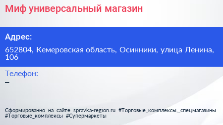 Миф, универсальный магазин по адресу 652804, Кемеровская область, Осинники, улица Ленина, 106 в дальнейшем Организация, размещена в следующих категориях: