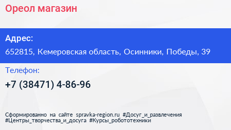 Ореол, магазин по адресу 652815, Кемеровская область, Осинники, Победы, 39 в дальнейшем Организация, размещена в следующих категориях: