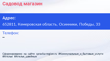 Садовод, магазин по адресу 652811, Кемеровская область, Осинники, Победы, 33 в дальнейшем Организация, размещена в следующих категориях: