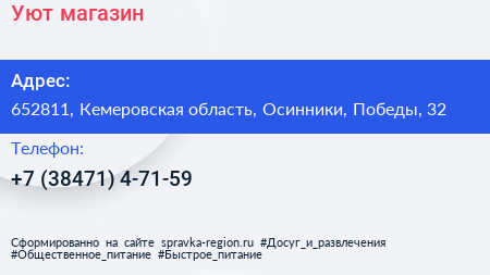 Уют, магазин по адресу 652811, Кемеровская область, Осинники, Победы, 32 в дальнейшем Организация, размещена в следующих категориях: