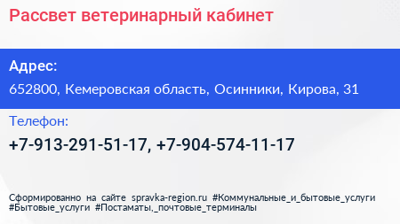 Рассвет, ветеринарный кабинет по адресу 652800, Кемеровская область, Осинники, Кирова, 31 в дальнейшем Организация, размещена в следующих категориях:
