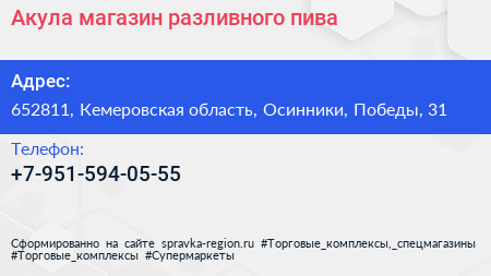 Акула, магазин разливного пива по адресу 652811, Кемеровская область, Осинники, Победы, 31 в дальнейшем Организация, размещена в следующих категориях: