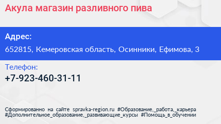 Акула, магазин разливного пива по адресу 652815, Кемеровская область, Осинники, Ефимова, 3 в дальнейшем Организация, размещена в следующих категориях: