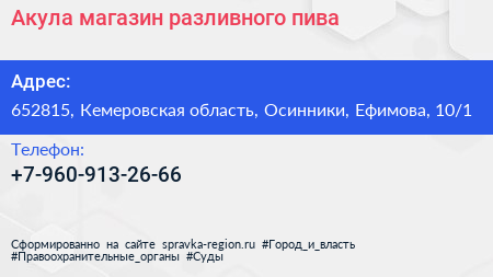 Акула, магазин разливного пива по адресу 652815, Кемеровская область, Осинники, Ефимова, 10/1 в дальнейшем Организация, размещена в следующих категориях: