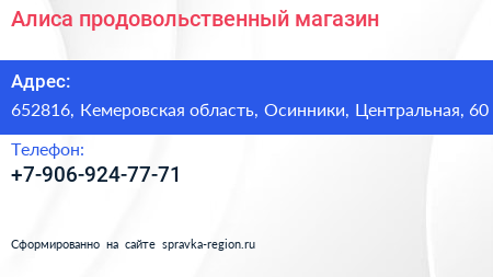 Алиса, продовольственный магазин по адресу 652816, Кемеровская область, Осинники, Центральная, 60 в дальнейшем Организация, размещена в следующих категориях: