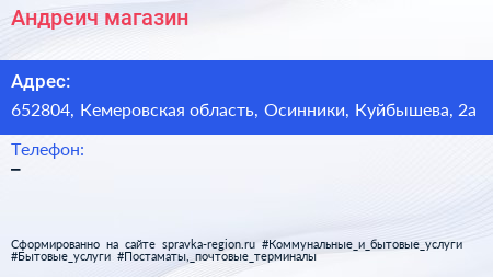Андреич, магазин по адресу 652804, Кемеровская область, Осинники, Куйбышева, 2а в дальнейшем Организация, размещена в следующих категориях: