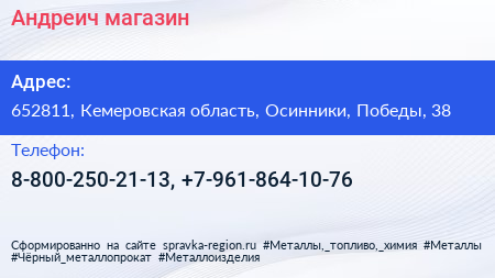 Андреич, магазин по адресу 652811, Кемеровская область, Осинники, Победы, 38 в дальнейшем Организация, размещена в следующих категориях: