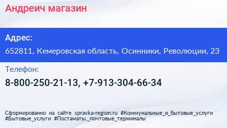 Андреич, магазин по адресу 652811, Кемеровская область, Осинники, Революции, 23 в дальнейшем Организация, размещена в следующих категориях: