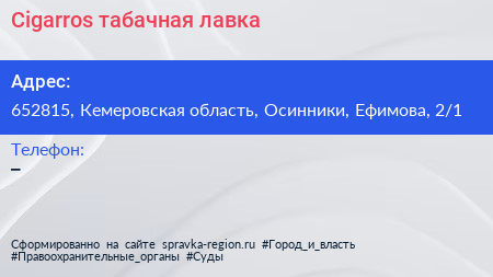 Cigarros, табачная лавка по адресу 652815, Кемеровская область, Осинники, Ефимова, 2/1 в дальнейшем Организация, размещена в следующих категориях: