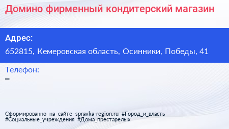 Домино, фирменный кондитерский магазин по адресу 652815, Кемеровская область, Осинники, Победы, 41 в дальнейшем Организация, размещена в следующих категориях: