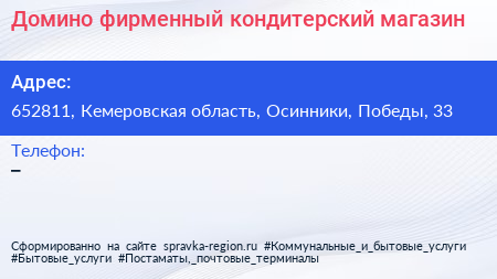 Домино, фирменный кондитерский магазин по адресу 652811, Кемеровская область, Осинники, Победы, 33 в дальнейшем Организация, размещена в следующих категориях: