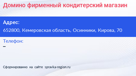 Домино, фирменный кондитерский магазин по адресу 652800, Кемеровская область, Осинники, Кирова, 70 в дальнейшем Организация, размещена в следующих категориях: