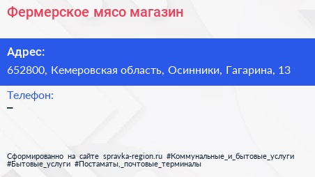 Фермерское мясо, магазин по адресу 652800, Кемеровская область, Осинники, Гагарина, 13 в дальнейшем Организация, размещена в следующих категориях: