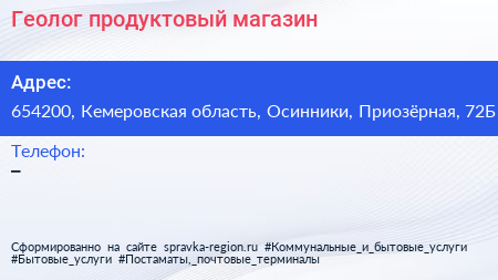 Геолог, продуктовый магазин по адресу 654200, Кемеровская область, Осинники, Приозёрная, 72Б в дальнейшем Организация, размещена в следующих категориях: