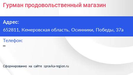 Гурман, продовольственный магазин по адресу 652811, Кемеровская область, Осинники, Победы, 37а в дальнейшем Организация, размещена в следующих категориях: