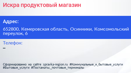 Искра, продуктовый магазин по адресу 652800, Кемеровская область, Осинники, Комсомольский переулок, 6 в дальнейшем Организация, размещена в следующих категориях: