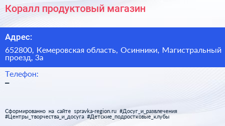 Коралл, продуктовый магазин по адресу 652800, Кемеровская область, Осинники, Магистральный проезд, 3а в дальнейшем Организация, размещена в следующих категориях: