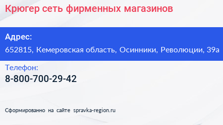 Крюгер, сеть фирменных магазинов по адресу 652815, Кемеровская область, Осинники, Революции, 39а в дальнейшем Организация, размещена в следующих категориях: