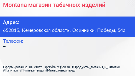 Montana, магазин табачных изделий по адресу 652815, Кемеровская область, Осинники, Победы, 54а в дальнейшем Организация, размещена в следующих категориях:
