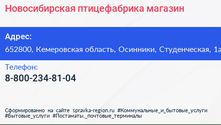 Новосибирская птицефабрика, магазин по адресу 652800, Кемеровская область, Осинники, Студенческая, 1а в дальнейшем Организация, размещена в следующих категориях: