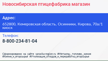 Новосибирская птицефабрика, магазин по адресу 652800, Кемеровская область, Осинники, Кирова, 70а/1 киоск в дальнейшем Организация, размещена в следующих категориях: