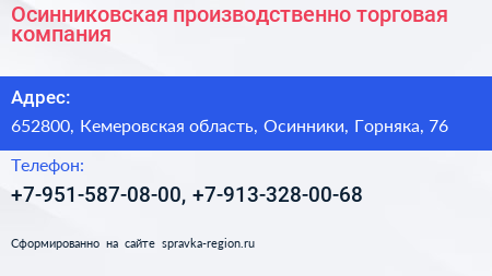 Осинниковская производственно-торговая компания по адресу 652800, Кемеровская область, Осинники, Горняка, 76 в дальнейшем Организация, размещена в следующих категориях: