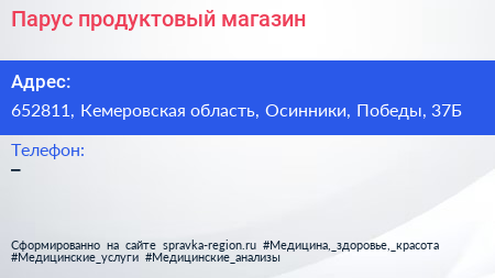 Парус, продуктовый магазин по адресу 652811, Кемеровская область, Осинники, Победы, 37Б в дальнейшем Организация, размещена в следующих категориях: