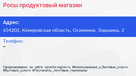 Росы, продуктовый магазин по адресу 654202, Кемеровская область, Осинники, Зорькина, 2 в дальнейшем Организация, размещена в следующих категориях: