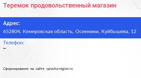 Теремок, продовольственный магазин по адресу 652804, Кемеровская область, Осинники, Куйбышева, 12 в дальнейшем Организация, размещена в следующих категориях: