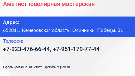 Аметист, ювелирная мастерская по адресу 652811, Кемеровская область, Осинники, Победы, 31 в дальнейшем Организация, размещена в следующих категориях: