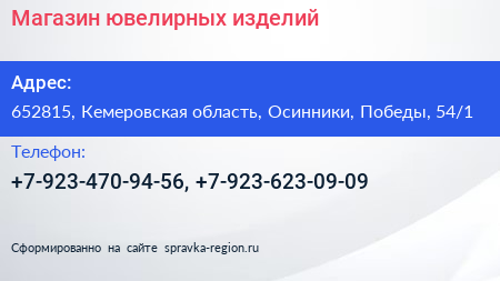 Магазин ювелирных изделий по адресу 652815, Кемеровская область, Осинники, Победы, 54/1 в дальнейшем Организация, размещена в следующих категориях: