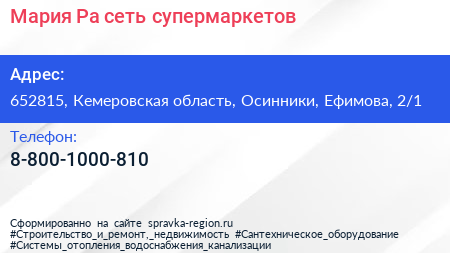 Мария-Ра, сеть супермаркетов по адресу 652815, Кемеровская область, Осинники, Ефимова, 2/1 в дальнейшем Организация, размещена в следующих категориях: