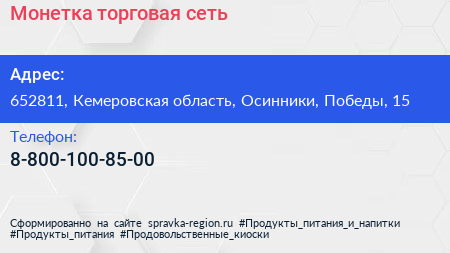 Монетка, торговая сеть по адресу 652811, Кемеровская область, Осинники, Победы, 15 в дальнейшем Организация, размещена в следующих категориях: