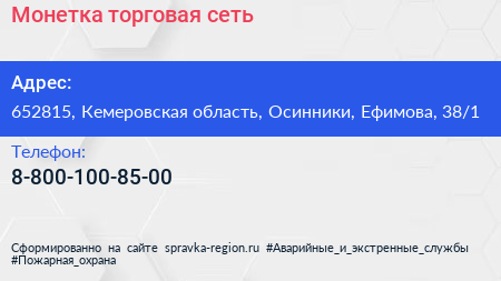 Монетка, торговая сеть по адресу 652815, Кемеровская область, Осинники, Ефимова, 38/1 в дальнейшем Организация, размещена в следующих категориях: