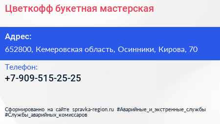 Цветкофф, букетная мастерская по адресу 652800, Кемеровская область, Осинники, Кирова, 70 в дальнейшем Организация, размещена в следующих категориях: