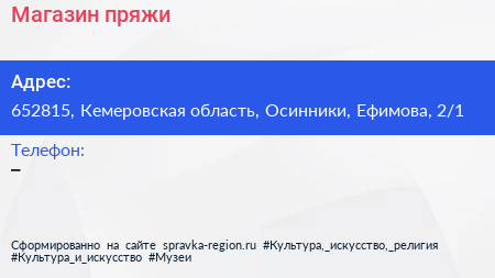 Магазин пряжи по адресу 652815, Кемеровская область, Осинники, Ефимова, 2/1 в дальнейшем Организация, размещена в следующих категориях:
