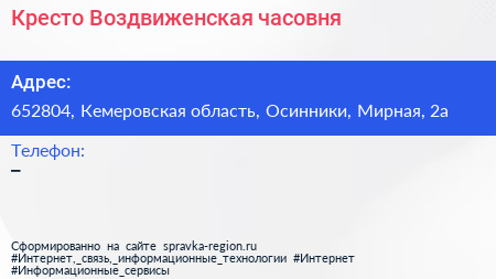 Кресто-Воздвиженская часовня по адресу 652804, Кемеровская область, Осинники, Мирная, 2а в дальнейшем Организация, размещена в следующих категориях: