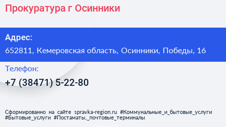 Прокуратура г. Осинники по адресу 652811, Кемеровская область, Осинники, Победы, 16 в дальнейшем Организация, размещена в следующих категориях: