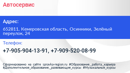 Автосервис по адресу 652811, Кемеровская область, Осинники, Зелёный переулок, 24 в дальнейшем Организация, размещена в следующих категориях:
