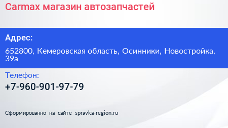 Carmax, магазин автозапчастей по адресу 652800, Кемеровская область, Осинники, Новостройка, 39а в дальнейшем Организация, размещена в следующих категориях: