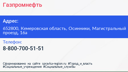 Газпромнефть по адресу 652800, Кемеровская область, Осинники, Магистральный проезд, 16а в дальнейшем Организация, размещена в следующих категориях: