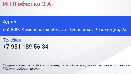 ИП Любченко З.А. по адресу 652800, Кемеровская область, Осинники, Революции, 2а в дальнейшем Организация, размещена в следующих категориях: